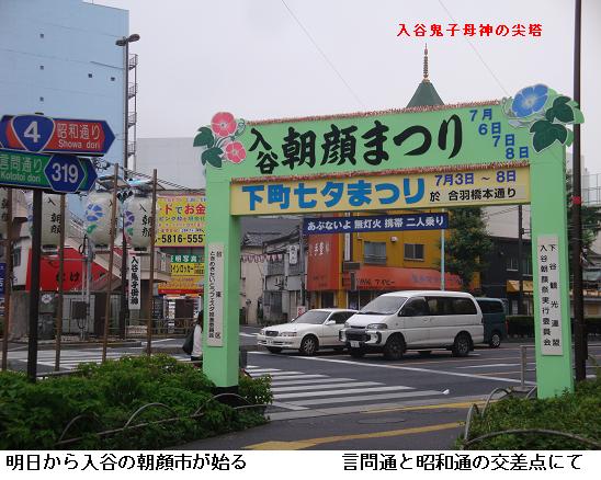 朝少々寝坊をしてしまい、5時30分から山谷堀公園を抜け、千束通りを通って言問通にでる。ここを西進し、金杉通りで口から引き返し入谷鬼子母神として知られる真源寺(日蓮宗)から昭和通をなんかする。明6日から3日間この真源寺周辺は朝顔市で賑わう。
