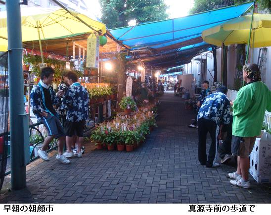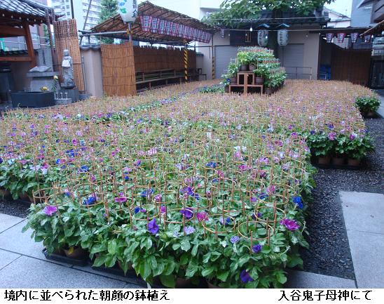 明治初期、入谷の十数軒の植木屋が朝顔造りを始め、年々大輪や珍花を咲かせ評判になったが、都市化の波と共に大正2年、一旦途絶えてしまうが、昭和25年に地元有志により復活したという。現在は、下町の夏を代表するイベントとして、全国に知られているという。売られている朝顔の鉢は、行灯造りが主流で、薄あずき色の団十郎が人気だそうだ。