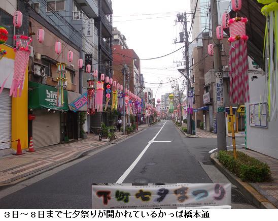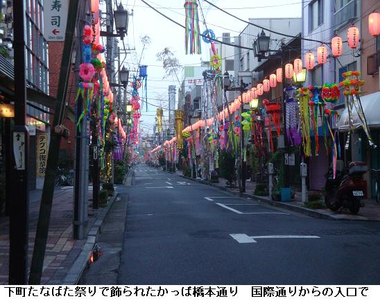 昭和通から七夕まつりで彩られたかっぱ橋本通りにはいる。毎年、7月に入ると此処上野駅入谷口に近い昭和通から浅草の国際通りまでの1.2キロの通り沿いには、彩り鮮やかな七夕飾りが登場する。平成年になってからは、カーテンのように下がる大型の竹飾りはみられなくなったが、期間中の土日には、パレードが行われて大変賑わうということである。