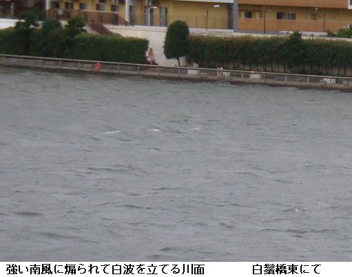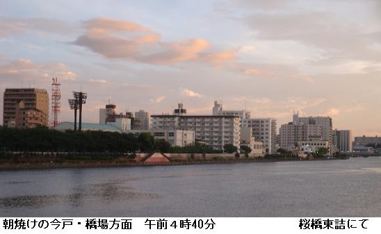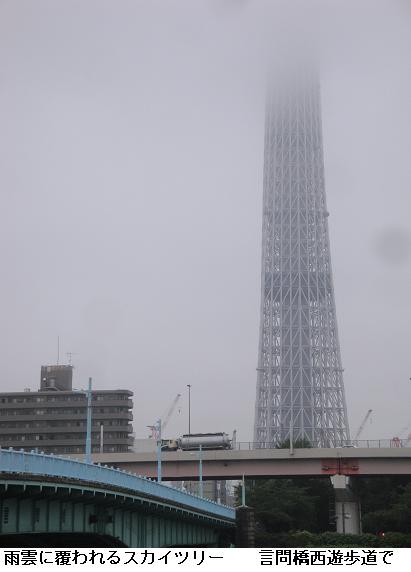 霧の立ちこめる隅田川の桜橋~水神大橋間をひと回り。霧のためスカイツリーは雲隠れ。大変蒸し暑く、汗が滲んでくるが、川面はいたって静か。昨夜北区や板橋区で土砂降りの被害が出たなどとはとても想像つかない。9222歩、5.99kmの徘徊であった。