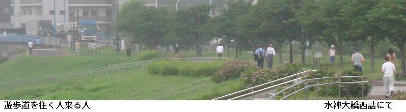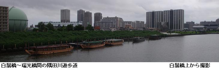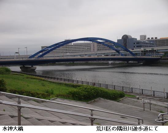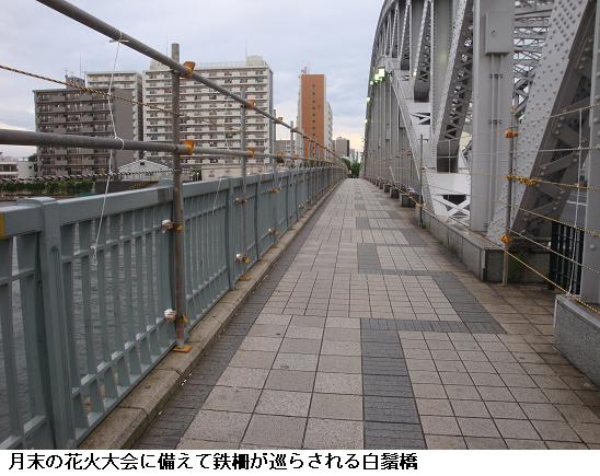 水神大橋をわたり、墨堤通りの鐘ヶ淵陸橋に出ると、防災団地に沿って南下し、桜橋を渡って帰宅する。隅田公園の周辺は今月末の花火大会に備えて方々に柵が設けられ始めた。万歩計には9793歩、6.36㎞の徘徊と記録されていた。