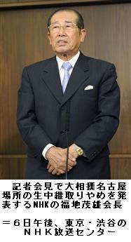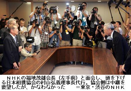 福地会長は6日午後8時43分から、2分間のミニ広報番組「NHKプレマップ」に単独で出演。生中継を行わず、ダイジェスト番組のみで対応する方針を視聴者に向けて説明した。会見と同様に視聴者から中継反対の意見が多いこと、相撲協会の改革の道筋が見えない状況を踏まえて判断したとし、最後に「視聴者の皆様にはご理解のほど、よろしくお願いします」と深々と頭を下げた。 (SANSPO.COM 2010.7.7 05:03)