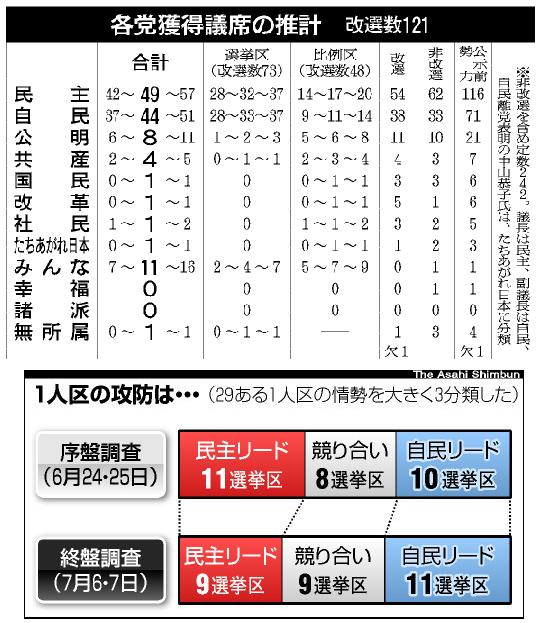 与党、過半数は困難 朝日新聞終盤情勢調査 ―― 11日投開票される参院選について朝日新聞社は6、7の両日、電話による終盤情勢調査を実施、取材による情報と合わせて分析した。それによると(1)民主党は序盤と比べて勢いを失いつつあり、選挙区、比例区合わせても40議席台にとどまる可能性がある(2)自民党は比例区で伸び悩むものの、選挙区では民主と互角で40台半ばの議席をうかがう(3)みんなの党は10議席を上回る獲得が有力になり、さらに上積みをはかろうとしている――などがわかった。 /選挙区で約4割、比例区で約3割が投票態度を明らかにしておらず、最終盤に情勢が変わることもある。 /民主の非改選議席は62。参院での単独過半数には60、国民新党とあわせた与党過半数には56議席が必要だ。単独過半数には遠く及ばず、与党でも過半数割れする公算が大きくなっている。/苦戦の大きな理由は、前回2007年には大勝した29の1人区の多くで、自民候補との厳しい戦いを強いられていることだ。安定した戦いぶりなのは岩手や滋賀など4選挙区にとどまる。山梨、三重、大分では優勢だった現職が追い上げを受けて逃げ切りに懸命なほか、栃木ではみんなの党も含めた3人の争いが激しさを増すなど、民主が優位だったり、ややリードしていたりした選挙区でもつれるところが目立っている。/12ある2人区では、民主と自民が1議席ずつをほぼ固めたところが序盤より増えた。民主は10選挙区で2人擁立しているが、議席独占の選挙区は生まれそうにない一方で、静岡で共倒れの可能性を残している。/五つある3人区と5人区の東京で各1議席は確保する可能性が高くなっているが、2議席目をめぐってはいずれも混戦になっている。/ 比例区では序盤より勢いを失い17議席前後にとどまりそうだ。/自民は選挙区で引き続き堅調だ。1人区では秋田で新顔が接戦から抜け出して優勢になるなど、民主を上回る7選挙区で優位をほぼ固めた。さらに愛媛、鹿児島で接戦から抜け出しつつあり、勢いは上向きだ。2人区でも各1議席の確保はできそうな状況だ。/3人区以上では、神奈川、愛知で優位を維持しているほか、埼玉でもやや優勢。ただ、そのほかの東京などでは当落線上で激しく競り合っている。比例区では11議席前後と苦戦が続くが、選挙区と合わせれば前回の37議席からは大きく回復しそうだ。/みんなの党は神奈川で1議席が有力になったほか、混戦模様の東京や、千葉、愛知で議席獲得の可能性があるなど、選挙区全体では4議席程度、比例区でも7議席程度と合わせて2ケタ台に乗せ、さらに上積みを目指す勢いだ。/公明は選挙区に3人を立ていずれも逃げ切りに懸命。比例区では前回をやや下回る6議席前後になりそうだ。/共産は東京の1議席をめぐって競り合っている。比例区では3議席前後。社民は比例区で2議席の可能性が出てきた。たちあがれ日本、新党改革、国民新は比例区で1議席を獲得できるかどうかの戦いとなっている。