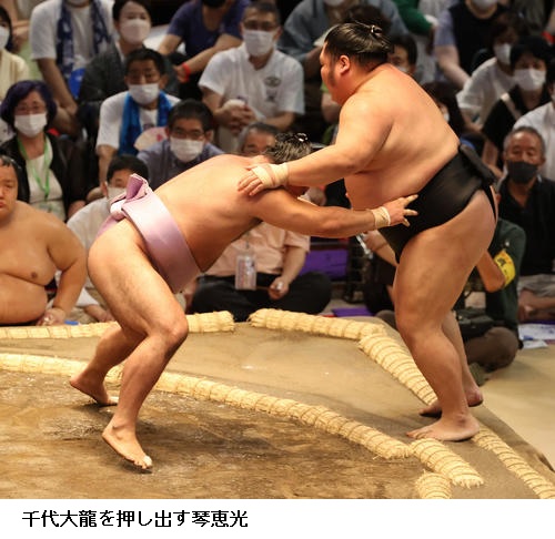 ▽千代大龍に琴恵光は取り直しの一番となり、琴恵光が押し出し。