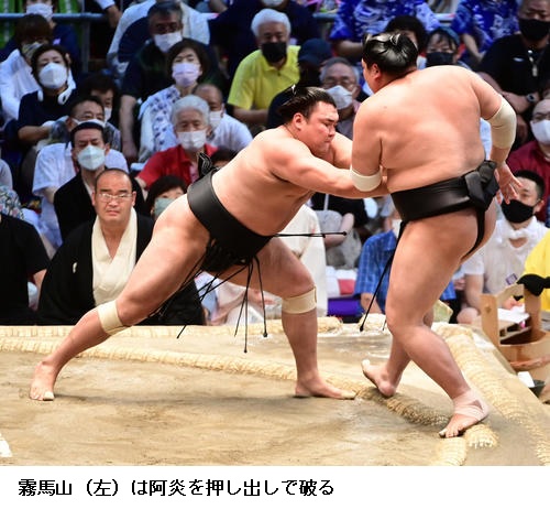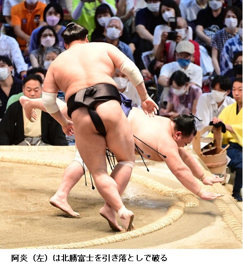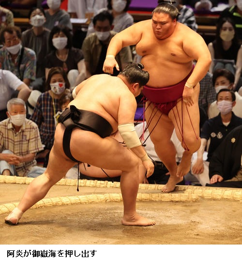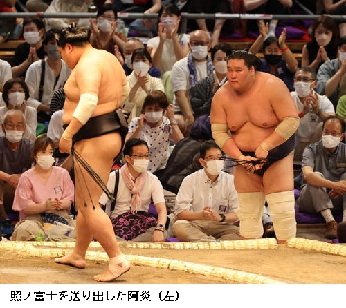 ☆阿炎 しっかり立ち合い当たって、重いっきりぶつかれた。北勝富士関の立ち合いも良かったので圧力で押されることもあったけど、うまく引き落とせた。(コロナの影響で休場者が続出している)休場した人たちはお大事になさってくださいという気持ちです。残った自分たちが思いきった相撲を取りたい。