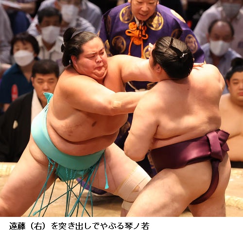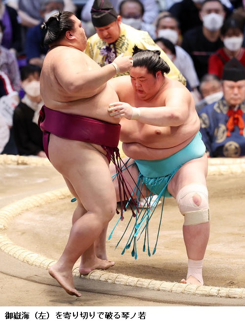 〇琴ノ若 攻められはしましたけど、引かずに形を作って自分の相撲を取れたので良かった。(土俵際まで追い込まれたが)先に引かず、あそこは我慢だと思った。まわしを取れたので勝機だと思って攻めました。(あすの大関戦について)やることは変わらないので、しっかり次につなげるような相撲をしたい。相手が誰とか関係なく、自分の良い相撲を取りたい。