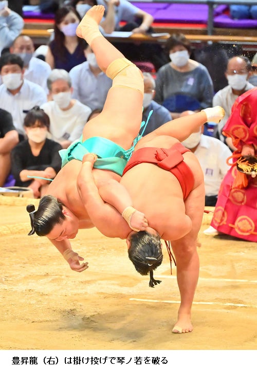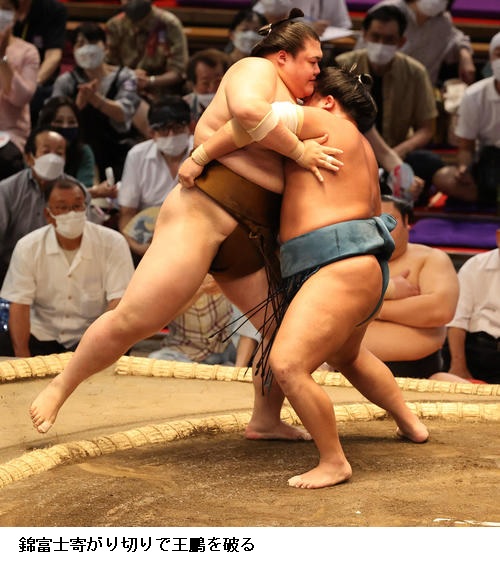 豊山は2連敗中だった王鵬に勝って「相手の方が体がでかいし相撲もいきいきしている。きょうは意地でも勝ってやろうと思って意地を見せられた。勝ち越しが目標だが上を目指したい」とハキハキと話しました。