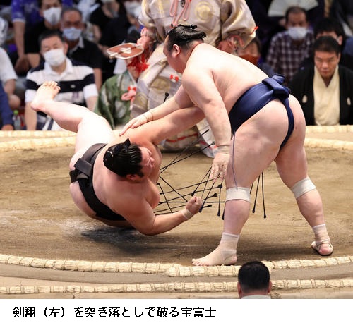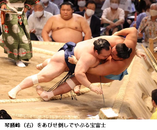 ☆宝富士 自分の相撲がとれたのでよかったです。体の調子もよくなったので。けがではないが、よくないところがあった。それが中日ぐらいでよくなって体が動くようになった。慢性的な足の痛みで疲労の影響もあった。毎日ケアしているのでそれがよかった。