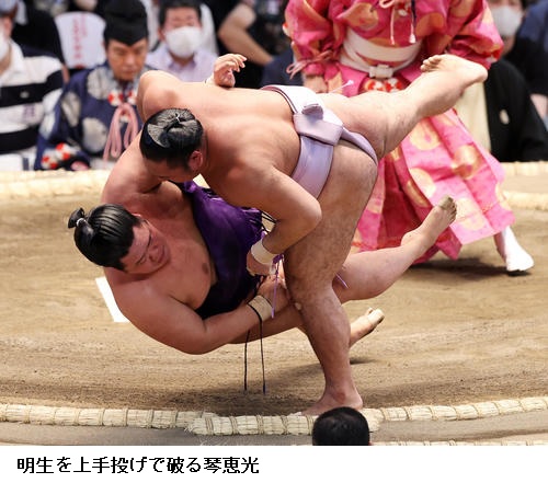 琴恵光は取り直しの一番で千代大龍を破り「攻める相撲が取れた。今場所は自分から攻めて流れのある相撲を取りたい」と話していました。