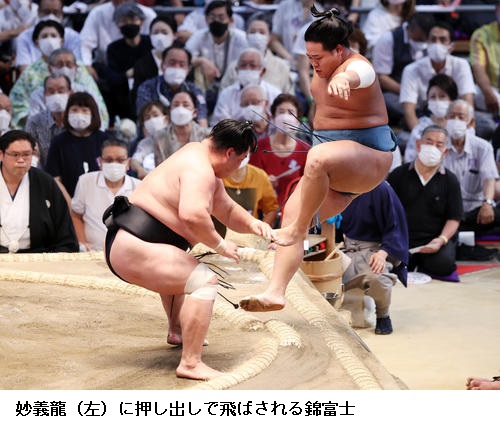 ▽新入幕の錦富士に大奄美は錦富士が押し出し。