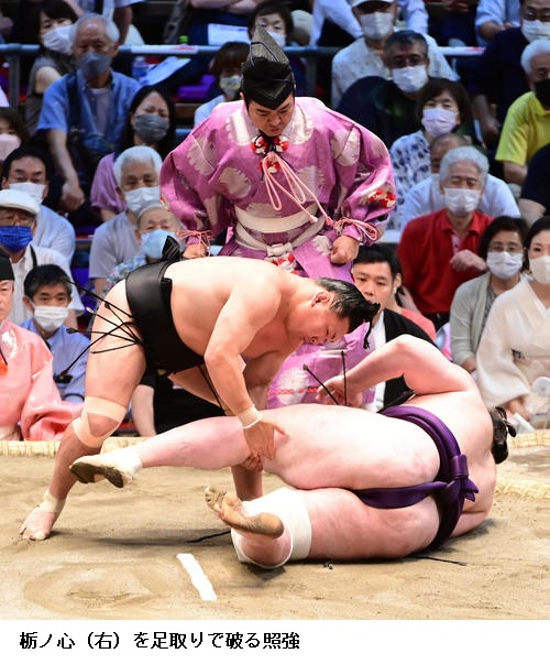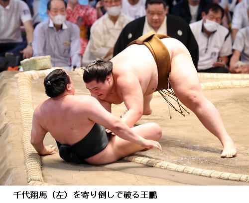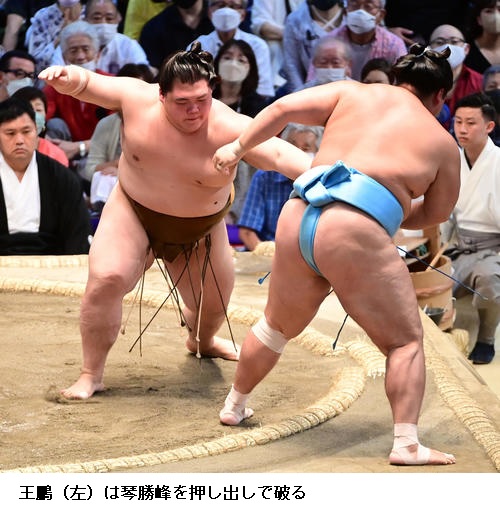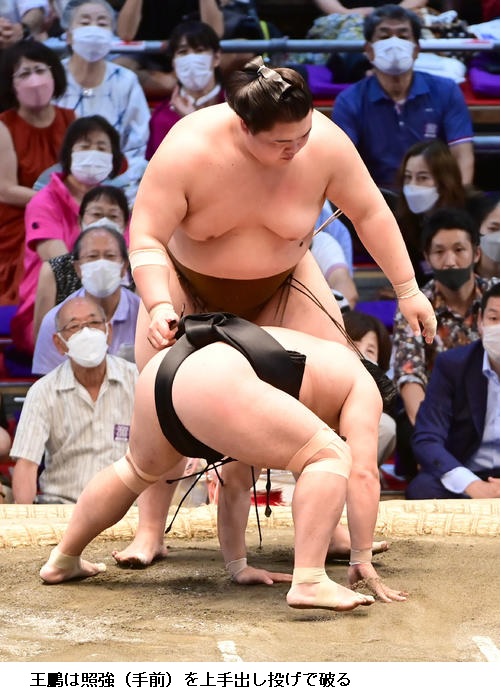 王鵬は、照強の足を取りに来る攻めを冷静に対処して幕内で初の勝ち越しを決め、「落ち着いてとれた。足を取る深さなどしっかり警戒できていたので自分が動かしやすい場所に相手を置くことができた」と冷静に振り返りました。