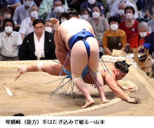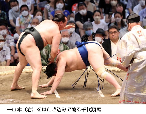 先場所初日から5連勝だった一山本は今場所も白星スタートで「きょうの朝、師匠に相手を見ることも大事だと言われたので、相手を見て突っ張ろうと思っていた。それができてよかった。暑さに負けずに頑張りたい」と元気に話していました。
