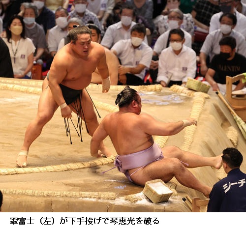 豊山は、翠富士を押し込みながらも土俵際で逆転され7敗目を喫し「最後決めにいこうとしたところをうまいことはたかれた」と悔しそうでした。