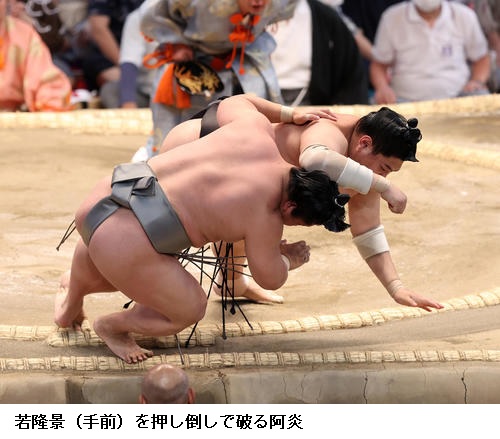 ☆阿炎 (若元春に)勝ちたい気持ちが前に出すぎた。立ち合いはよくなかったが、体が動いて勝ちにつながったので、集中していけたと思います。