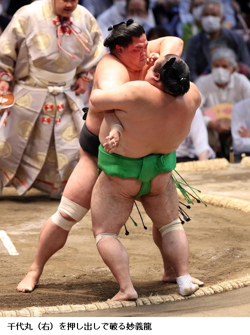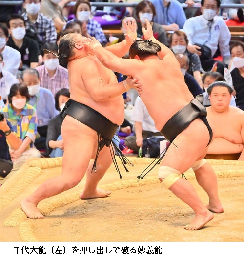 ▽妙義龍に千代大龍は、妙義龍が押し出しで勝ち越しを決めました。