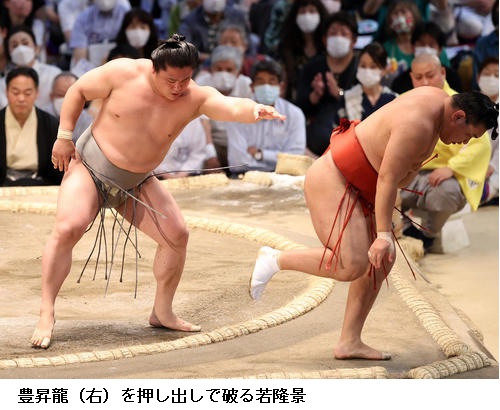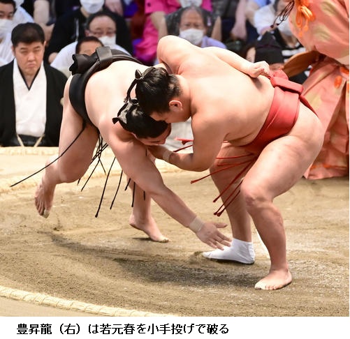 ▽豊昇龍に若元春は豊昇龍が小手投げで勝ち越しました。若元春は負け越しました。