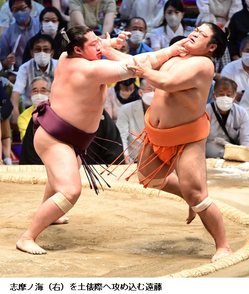 ▽志摩ノ海に遠藤は、遠藤が寄り切り。
