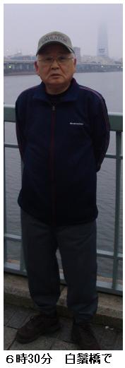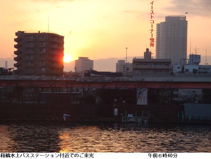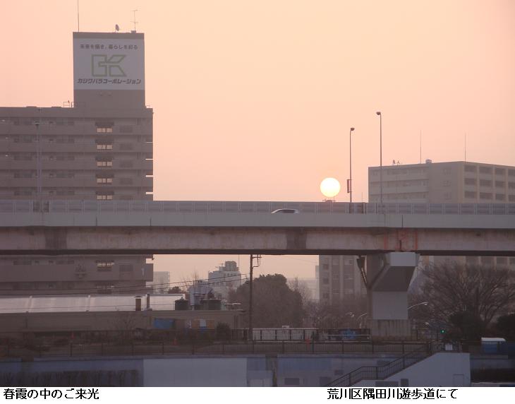 早や今日は雛祭り。午前5時20分朝の徘徊に出掛ける。隅田公園内で万歩計の調整。100歩歩いては万歩計の標示を照合。同じことを3回繰り返す。空が白む頃は靄がかかり霞んでいたが、帰り道桜橋手前でご来光。どうやら今日は晴れるらしい。
