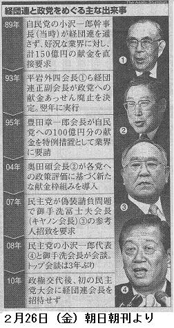 「諸君の方では禁止したらいいちゅう論調でやってんじゃないの? 鳩山由紀夫首相からも指示があったし、マニフェストでも言っているし、企業・団体献金はやめようという方向で与野党まとめていきたい。政党助成金という国民みんなが負担して政治活動を支援するというシステムができており、企業・団体献金廃止の方向性は何ら問題ない」 (産経ニュース、2010.3.8 19:41)