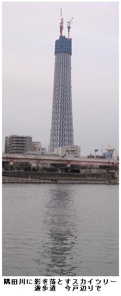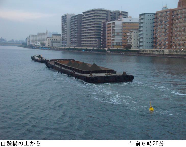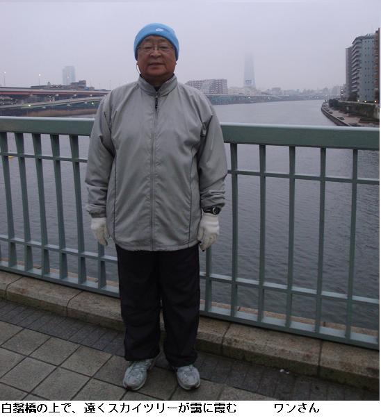 午前5時30分。まだ真っ暗の言問橋を渡り、水戸街道を北上。四つ木橋南で鐘ヶ淵通りに入る。東武伊勢崎線鐘ヶ淵駅辺りで辺りが明るくなる。墨堤通りを横切って、水神大橋を渡り、荒川区の隅田川遊歩道を南下。周りは春の霞で、東京スカイツリーも遠くにぼやけて見える。明治通りを横切り件の剃刀堤防が続く台東区の落書き通りを南下、帰宅する。