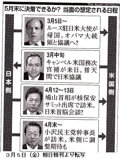 一方、社民党では福島党首が中心となり、米領グアムなどへの国外移転を主張。さらに、自衛隊大村航空基地(長崎県)など、沖縄県外への移転案がある。重野幹事長は4日の与党幹事長会談で、「議論を尽くすべきだ」と訴え、移設先決定の加速化をけん制した。しかし、米側は海兵隊の即応性を維持するためには沖縄の陸上部隊とヘリ部隊が一体であることが不可欠だとしており、県外、国外移転に応じる可能性は極めて低い。/平野官房長官や北沢防衛相が関心を持つとされる徳之島(鹿児島県)への移設・訓練移転案も、徳之島町長は住民投票で受け入れを諮る可能性に含みを持たせるが、反対論が大勢を占めているとみられる。/一方、米国は、5月までは日本側の動きを見守る構えだ。ただ、新たな案がまとまっても、「議論には応じるが、現行案が最善の道だ」(キャンベル国務次官補)との立場は崩さないとみられ、日米双方で「普天間の現状維持やむなし」との声が広がりつつある。 (2010年3月5日08時47分 読売新聞)