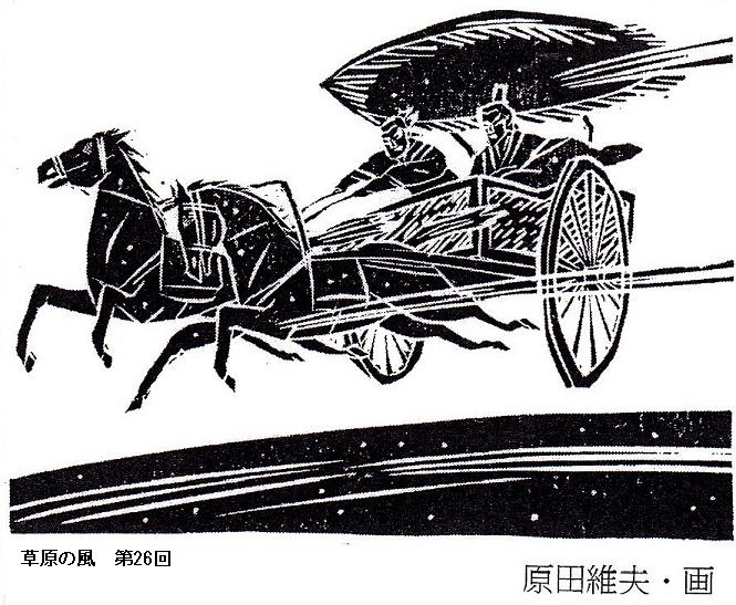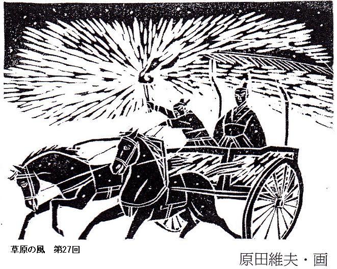 横浜のIN氏からクロネコメール便が届いた。読売新聞連載の「草原の風」(第12~31回)のコピーと添え書の通信文が同封されていた。添え書に曰く「前略 毎日、元気に淺草を渉猟しておられることと思います。/昨日、電話で御意を伺いましたが、わたしの好きな中国小説の作家・宮城谷昌光氏の新作「草原の風」の冒頭部分をコピーでお送りして見ます。(中略)君に、この小説を読んでみてもらいたかったのは、二つの理由があります。/ひとつはルビを多用してあること。わたしは君から頂戴する刊行物のルビにどんなに助けられているか分かりません。ルビがあれば、自信を持って先に読み進められるからです。/この漢字はなんと読むのか自信を持って再確認しながら、先に読み進められる安心感は、やはりルビの有無によるところが大きいと思っています。/もうひとつは、新聞、雑誌、週刊誌などの連載小説は挿絵がなかなかおもしろいということを味わってもらおうという気持ちからです。/本文そのものは、何れ単行本になって一気に読むことができますが挿絵はどういうわけか、単行本には載らないのです。/今回の原田維夫(つなお)氏は長年、宮城谷氏とコンビを組む版画家ですが、この版画の筆致が動きがあって、雄渾でいい。例えば26回、27回のように馬車が宙を跳んで駆けるというような場合の挿絵は面白いとおもいます。(後略)/いろいろ書きましたが、本便の目的は、『草原の風』の初めの部分(不完全コピー)をお送りする添え状なのです。悪しからず。/草々」