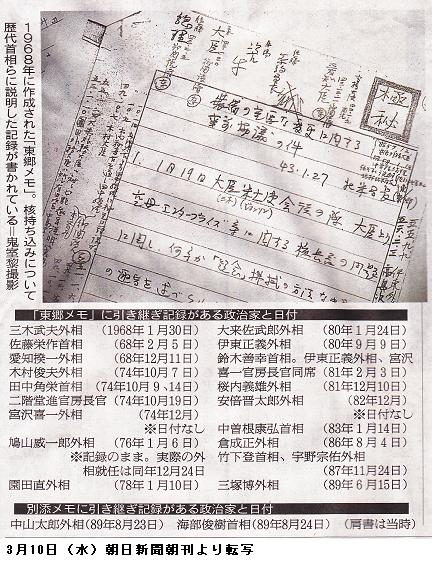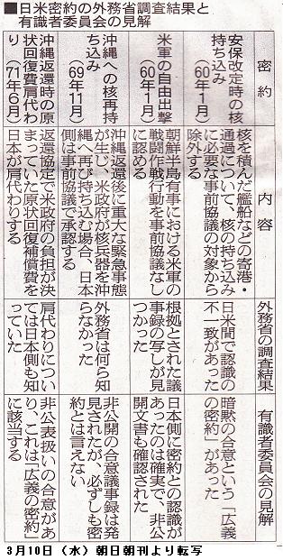 米海軍基地を抱える長崎県佐世保市では9日夕、外務省幹部が朝長則男市長らに報告書を説明し「迷惑をかけて申し訳ない」と謝罪した。朝長市長は「核搭載艦船の寄港は『今はない』ということなので信頼したい。ただ、有事の際は定かでなく、それが国の課題だと申し上げた」と報道陣に語った。/同じく米海軍基地がある神奈川県横須賀市の吉田雄人市長は「うそを含む不正直な説明が続けられ、修正の努力もなかったと聞き、言葉も出ない」と不信感をあらわにした。実際に核搭載艦船が寄港したかどうかについて「それが分からないのが問題。常に米軍の艦船が入港する自治体として説明を求めたい」とした。/米軍普天間飛行場の移設問題で揺れる沖縄。基地問題に取り組む沖縄平和運動センターの山城博治事務局長は「沖縄の米軍基地内には現在も核が持ち込まれているとの見方もあり、今も生きている日米間の密約が他にもあるはず」と指摘した。【山下誠吾、吉田勝、井本義親】 (毎日新聞 2010年3月10日 東京朝刊)