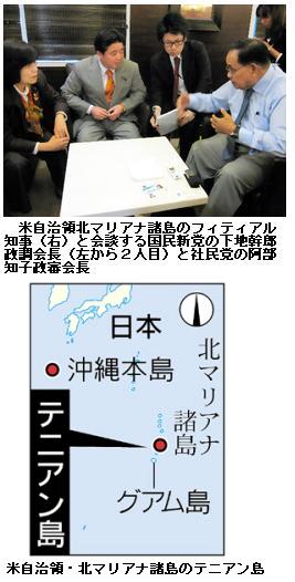 北マリアナ知事、普天間受け入れ前向き グアム視察団が現地入り ――【グアム=加納宏幸】社民党の阿部知子政審会長、国民新党の下地幹郎政調会長らは10日、サイパンを訪れ、同島、テニアン島などを含む米自治領・北マリアナ諸島のフィティアル知事と会談した。下地氏が「サイパンとテニアンの両方で沖縄の米軍基地の負担を担うことができないか」と述べ、米軍普天間飛行場(沖縄県宜野湾(ぎのわん)市)の受け入れや訓練移転などの協力を要請したのに対し、同知事は「ウエルカムだ」と応じ、前向きに検討する考えを示した。/フィティアル氏はさらに「米政府がきちんと言わないとできないことだが、北マリアナ諸島の考え方としては賛同する。ただ、町が復興できるかどうかを見定めていきたい」と語った。10日夜、サイパンからグアムに入った下地、阿部両氏が記者団に会談の内容を明らかにした。/社民党は普天間飛行場のグアム移設も視野に入れているが、阿部氏はフィティアル氏の発言について、「社民党が(移設先を)提案するとき、グアム以外にも、テニアンやサイパンのネットワークの中で受け入れられる可能性が広がった」と歓迎した。/一方、下地氏ら普天間飛行場の移設先を検討している政府・与党の沖縄基地問題検討委員会のグアム視察団は10日夜、同島入り。視察団は松野頼久官房副長官が団長を務め、外務、防衛両副大臣や社民、国民新両党議員が参加。11日朝からアンダーセン空軍基地、アプラ港海軍基地を視察し、グアムのカマチョ知事を表敬訪問することにしている。/米軍再編計画では、在沖縄海兵隊の司令部要員約8000人がグアムに移転することになっており、施設の整備状況を把握するのが表向きの視察の目的だ。ただ、社民党には普天間飛行場の機能をグアムやテニアン島に移す可能性を探る狙いがある。 (産経ニュース、2010.2.10 23:21)