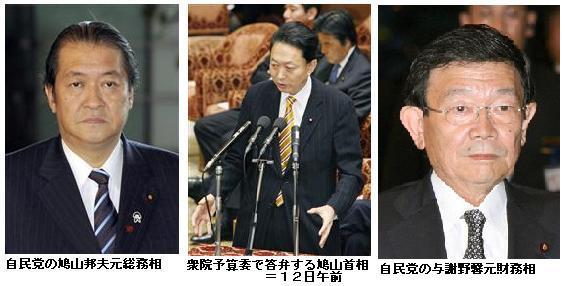 実母資金提供「邦夫氏は質問評価」と与謝野氏 ―― 自民党の与謝野馨・元財務相は14日、テレビ朝日の番組で、12日の衆院予算委員会で、鳩山邦夫・元総務相との会話をもとに、鳩山首相への実母からの資金提供を追及したことについて、邦夫氏が「きょうの質問はよかった。私はあなたの話を裏付けます」と述べたことを明らかにした。/与謝野氏によると、予算委後、邦夫氏が与謝野事務所を訪れ、質問を評価した上で、「あれは俺と母の会話なんだ」と説明したという。/与謝野氏は12日の予算委で、「兄貴はしょっちゅう母のところに行き、子分に配るカネをもらっていた」と邦夫氏が語っていたと紹介し、事実関係をただしたが、首相は「全くの作り話だ」と反論。邦夫氏は13日に記者会見し、「兄が金を無心した話は母から聞いてない」と説明した。 (2010年2月14日19時15分 読売新聞)