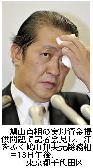 首相の「カネ無心」聞かぬ、知らぬと邦夫氏 ―― 自民党の鳩山邦夫・元総務相は13日午後、都内で記者会見し、鳩山首相の偽装献金事件を巡り、与謝野馨・元財務相が邦夫氏の話に基づき首相が母親に資金提供を求めたと指摘したことについて「兄が母にカネを無心したという話は、母から聞いていないし、私も事実を全く知らない」と述べた。/邦夫氏は、与謝野氏に話したという、母親とのやり取りについて「母から別の話で電話を受け、『お兄さんは子分がいっぱいいて、大変お金がかかるという話だが、あなたは子分がいないの?』と(言われた)」と改めて説明。そのうえで「カネの無心(を首相がした)ということは聞いていない。それが独り歩きすると困る。(カネがかかるという話を誰が母にしたのか)全然分からない。第三者かもしれない」と語った。/自民党が母親ら関係者の証人喚問を求めていることについて、邦夫氏は、「私はコメントする立場にない」と述べるにとどめた。