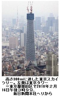 東京スカイツリー、300m超える ―― 東京・墨田区で建設中の東京スカイツリー(完成時高さ634m)の高さが16日、地上300メートルを超えた。/明石海峡大橋(神戸市―兵庫県淡路市)の主塔(297メートル)を抜き、国内では、1958年完成の東京タワー(333メートル)に次ぐ高さの建造物となった。3月下旬~4月上旬には東京タワーを抜き、高さ日本一の記録を半世紀ぶりに塗り替える。/この日午後2時過ぎ、タワークレーンが地上からつり上げた鉄骨をタワー中心付近に据え付けると、低層部に設けられた高さを表示するシートが「296m」から「303m」に切り替わり、見物人らがデジタルカメラなどのシャッターを盛んに切っていた。 (2010年2月17日03時33分 読売新聞)