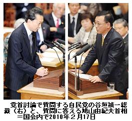 党首討論:政治とカネ問題に終始、内容乏しく 民主政権初 ―― 新政権発足後、初の党首討論は政治とカ ネの問題に終始した。自民党の谷垣禎一総裁は38分間のうち28分、公明党の山口那津男代表は11分のうち9分を割いたものの、鳩山由紀夫首相の答弁は、12日に開かれた衆院予算委の集中審議とほぼ同じ。内容の乏しいトップ同士の論戦を初傍聴した与野党の新人議員は「説明不足」「党首討論は追及の場ではない」と、それぞれの立場で不満をあらわにした。/自民党の小泉進次郎氏(28)は「総理の仕事は国民に税金を払ってもらって国を運営すること。本人が払っていなかったのに国民に納税をお願いできるのか」と指摘。「カネの問題が続出する民主党は、利権政治に縛られたかつての自民党と同じ道をたどろうとしている」と話した。/斉藤健氏(50)は「初傍聴で期待していたが、時間が短すぎて予算についての討論が少なかった」と不満足げ。その上で「12億円もの資金を『秘書が管理していて存在を知らなかった』などと繰り返している限り、この問題を決着させるわけにはいかない。証人喚問や参考人招致を開くべきだ」とさらなる説明を求めた。/一方の民主党の新人の横粂勝仁氏(28)は「党首討論は追及の場ではなく、与野党のリーダー同士が国の根本を話し合う機会のはず。あの約45分を有効に使えば、子育てに苦しんでいる人や仕事がない人を助けることもできるのに」と野党の姿勢を嘆いた。/長島一由氏(43)は「集中審議の焼き直し。そもそも総理は(資金提供の判明後)納税しており、『総理に脱税疑惑があるから国民が税金を払わない』というのは論理の飛躍」と批判した。 ――毎日新聞 2010年2月17日 21時29分(最終更新 2月17日 22時43分)