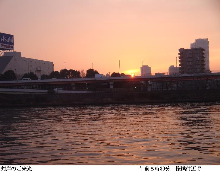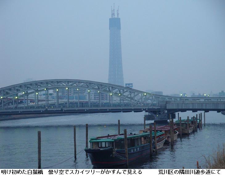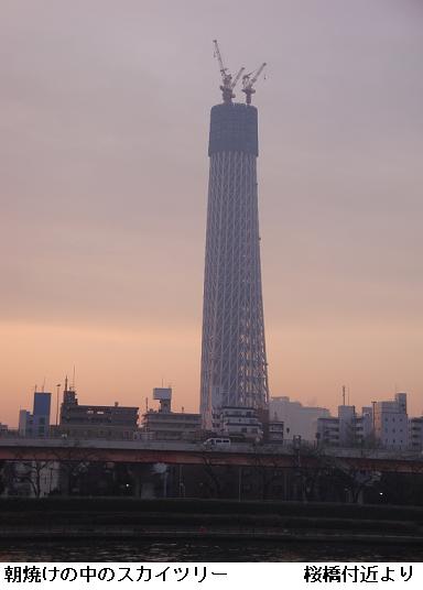 昨夜は眠れず、今朝は5時半頃から隅田川べりを徘徊。水神大橋辺りで漸く白んでくる。右手に朝焼け空を望みながら隅田川沿いの遊歩道を南下する。何処となく春の兆しが感じられるようになった。東京スカイツリーは300mを超えたそうだ。朝焼けの中のスカイツリーを見やりながら帰宅した。