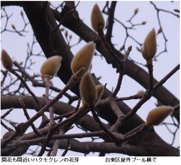 屋外プール脇のハクモクレンの花芽が膨らんでもうすぐ開きそうだ。