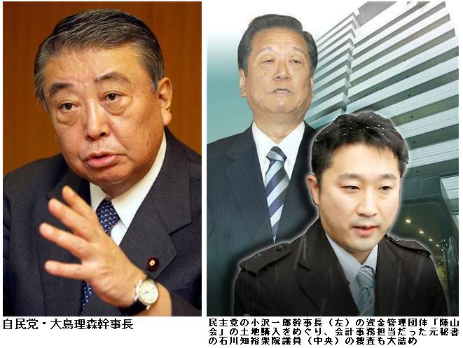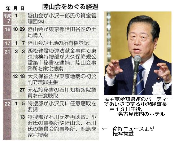 小沢氏続投「世論は持つのか」…民主執行部苦悩 ―― 民主党の小沢幹事長の資金管理団体の土地購入を巡り、小沢氏の秘書だった同党の石川知裕衆院議員が逮捕された事件で、小沢氏は検察と全面対決する考えを強調した。/鳩山首相と党執行部は小沢氏を支えることで一致したが、小沢氏に依存せざるを得ない体質の危うさも露呈している。