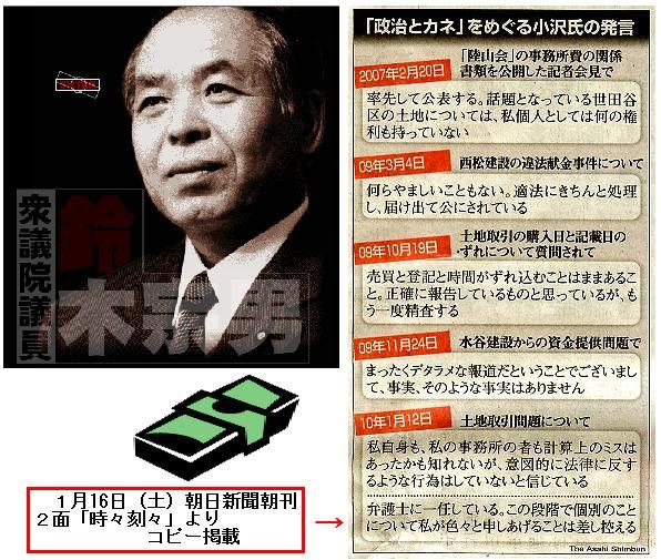 ■裏金:聴取の焦点となった土地代金の原資。小沢氏は今月16日の党大会で「何ら不正なお金を使っておるわけではありません。個人資金でございます」と強弁した。/しかし、特捜部の目は“ゼネコンからの裏献金”に向いている。党大会での言葉を4つ目の「ウソ」とみているのだ。/小沢氏の地元、岩手県奥州市で進められている胆沢(いさわ)ダム工事をめぐり、水谷建設元幹部らが土地購入があった16年10月に民主党衆院議員の石川知裕容疑者(36)に裏金5千万円を渡したと供述しており、これらの供述が詳細を極めているからだという。/また、水谷建設元幹部らは17年4月に大久保容疑者に5千万円を渡したとも供述している。同年3~5月には小沢氏から陸山会に4億円が入金され、同額が戻されるという不自然な資金移動があった。/石川、大久保両容疑者は水谷建設を含めたゼネコンからの裏献金を否定しているとされる。しかし、特捜部は土地代金の原資に裏献金が含まれていたとみて、ゼネコン捜査を継続している。(産経ニュース、2010.1.24 00:30)