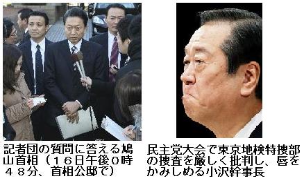 検察庁と検察官は、捜査・逮捕・起訴権を唯一許諾された最高の権力を持っていて、その権力の執行には最大限の注意と慎重さが要求されるが、今の検察庁と検察官が行っていることは、自分たちの既得権益を守るためには、たとえ法律を犯してでも妨害するものを排除するという、まさに「検察ファッショ」そのものであるようだ。だとすれば、鳩山首相と検察の直接指揮権者である千葉法相は、民主党政権の「全存在」を挙げて「検察の暴走」を直ちに止めさせねばならない。そしてすべての責任者を特定して彼らに責任を取らせるべきである。/戦後60年以上一度も「改革の手」が入ってこなかった「国家の中の国家」となってしまった日本の「検察・警察・司法」を、今こそ国民目線で「大改革」すべきではなかろうか。また「検察の暴走」を批判する事もなく、逆に検察による世論誘導に積極的に協力してデマ情報を流してきた大手マスコミにもその責任を取らせるべきである。