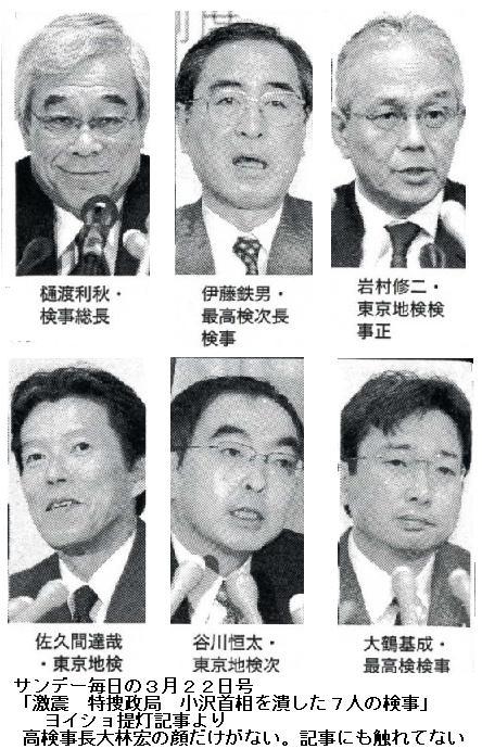 3)「いま検察が絶対阻止したいのは、検事総長人事に手を突っ込まれること。樋渡利秋検事総長は65歳定年までという定年規定に従い任期満了前の今夏にも勇退するはずですが、その後任に大林東京高検検事長にきちんとバトンタッチすることが最大の関心事なのです。その障害になることは、あらゆる手段を使って取り除こうとする。検察の狙いはズバリ、今夏の参議院選挙での【民主過半数阻止】ですよ」(法務省幹部)