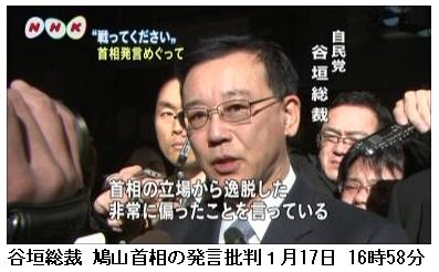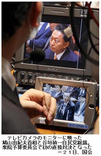 ≪尻切れトンボ?≫ それだけに、迫力に乏しい感は否めず、初対決を見ていた自民党議員は「尻切れトンボみたいになっちゃった」と偽装献金問題などへの追及がまだ甘かったと指摘したほか、公明党からは「もっと経済や景気の問題をやってほしかった」(国対幹部)という苦言が出た。審議が空転するほどの新事実の発覚や首相の答弁ミスもなかった。/それでも谷垣氏は、首相が実母からの資金提供を知っていたことが明らかになれば議員辞職すると答弁したことに「しっかり記録にとどめておかなければいけない」と成果を強調した。/首相も、通常国会の早々から野党の執拗な追及を味わった。鳩山内閣への支持率が急落する厳しい状況の中、今後も綱渡りの答弁が続くのは間違いない。