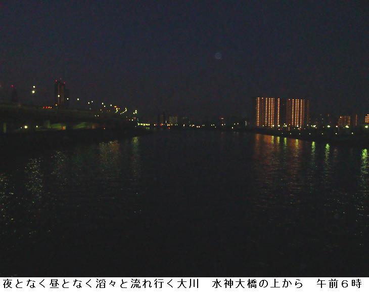 まだ明けやらぬ水神大橋の上に立ち止まり、大川の流れに眼をやる。天地の間にあって、世の中でどんなことがあろうが、こんな俗世間のことは余計なこととばかりにいつも同じように滔々と流れてゆく。この娑婆世界の濁りを載せて何時まで経っても澄むことなく悠々と流れているように見える。何も望んだわけでもないが戦乱の世に生を受け、目の当たりに戦禍も見たが、ようやく平和がおとずれても、世の中の騒がしさ一向に治まらぬ。それでも、少しは心を落ち着かせる術(すべ)も得て、まあこの人生も棄てたものじゃないと思ったときは既に老いが我が身を覆い、目の前には死が迫っている。来月には齢(よわい)78歳、いくら寿命が伸びたといっても、とうの昔に人生の峠は越えている。あとは下り坂だけ、どこでお陀仏しても不思議はない。まあ、天と地の間にあって、人生なんて余計なものでしかありえまい。