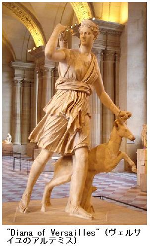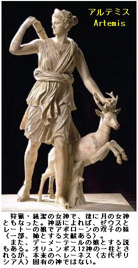 女神Artemis(アルテミス)はギリシア神話に登場する狩猟・純潔の女神である。のちに月の女神ともなった。アルテミスはアポローンの姉妹としてゼウスとレートの間の子とされている。この二神は双子ともいわれ、あるいはアルテミスが先にオルテギュア(「うずらの里」)で生まれ、ついでデーロスでアポローンが生まれたということになっている。この「うずらの里」というのも瞭(はっ)きりせずイオーニアの大市あるいはアイトーリア州の古都カリュードンとも、更にはシチリア島の大都シュラクーサイにあるオルテュギアー島だとも、又デロース島に他ならないともいわれ、アレクサンドリア期以降は専らこの最後のデロースと説が通用してきた。