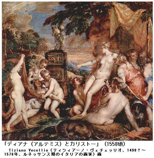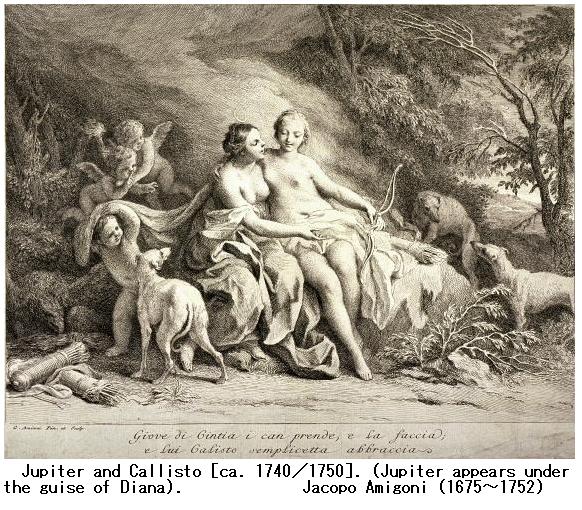 ギリシア神話:ニンフ・Kallisto(カリストー)は通例はアルカディア族の祖リュカーオーンの娘、あるいは孫となっている。彼女は世の常の少女のように糸を紡いだり織ったりするのを好まず、身なりを整え粧いを凝らすことにも意を用いず、流れる髪を白い紐で束ねたまま、槍や弓を手にして、もっぱら女神アルテミスの扈従(こじゅう)に連なりアルカディアの山野を馳せて狩猟にのみ日を送っていたという。女神からも厚い寵愛を受けていたが、ある日のこと天上から遥かに大神ゼウスがその姿を認め、活き活きとして愛くるしい彼女に対して例のごとくに劇(はげ)しい欲情を抱き初めた。夏のある真昼のこと疲れて一人伴侶から離れ、深い森の樹陰で彼女が箙を枕に柔らかい草の上に仮睡していたとき、ゼウスは目ざとくそれを見つけ、こっそりとオリュンポスの峯を降って来らしゃった。アルテミス女神の姿に変じてその傍に立ち、今日の狩倉の様子を訊ねた。無邪気な少女は一点の疑念も挟まず、嬉々として女神に答え、優しい愛情とはにかみとを示すのにゼウスは遂に耐え切れず、いきなり胸に抱き取って接吻した。それはいつもの女神らしくもない荒々しく劇しいものであったという。御神は遂に真の姿を現され、驚きと共に畏れて拒む乙女の力もついにゼウス神には抗い得なかった。それから暫く彼女は秘密を知る森を憎んで槍も箙も壁に掛けたまま棄て置かれた。しかし、やがてまた狩倉の魅惑に抗いきれず、彼女はいつとはなくにアルテミスの扈従の群れに加わるようになった。初めはゼウスの変身かと恐れられた女神からも、付き添う他のニンフたちにも迎え取られ、疚(やま)しさからの恥じらいも気付かれずに済んだ。