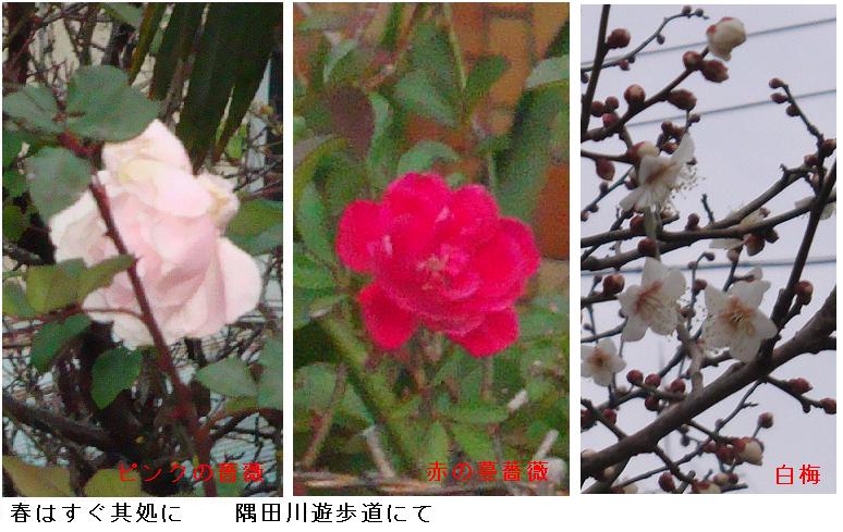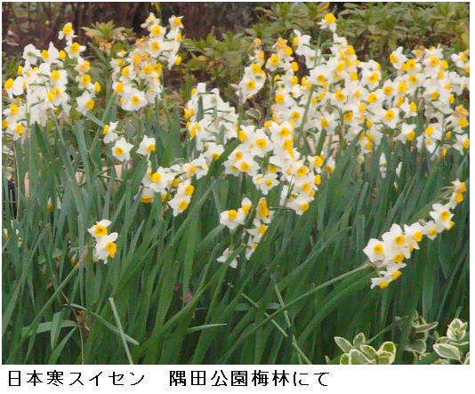 白鬚橋の上に立つと、Anemoi(アネモイ)の気まぐれか、昨日までBoreas(ボアレス)が居座っていたのが嘘のようで、気味の悪いほど温かいZephyros(ゼピュロス)が頬を撫でて行く。遊歩道を南下すると、所々で春の兆しが見られる。梅林の梅は一段と色合いを増したようだ。梅木の根元には「日本寒スイセン」が今を盛りと咲いている。