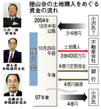 「小沢一郎民主党幹事長の政治資金団体「陸山会」が2004年10月に3億4千万円で購入した世田谷の土地の購入資金4億円は、銀行からの融資が間に合わなくて小沢氏が一時的に妻の和子さんから借りて用立てした金であった、ことが小沢氏周辺の証言で判明したとのことである。/妻和子さんは新潟の中堅ゼネコン福田組の前会長の娘で大株主であり、鳩山首相の母安子さんほどではないが大金持ちであり、4億円の用立ては特に問題はなかったとのこと。/東京地検特捜部は、「陸山会」による世田谷の土地の購入資金4億円の原資は小沢一郎民主党幹事長がゼネコンから受託した闇献金であり強制捜査の対象になる、との筋書きを立てていたが、その前提が全面崩壊したのである。/東京地検特捜部は、強制捜査前から大手マスコミに嘘の情報をリークして「小沢一郎は金権政治家で悪質である」との世論誘導を狙ってきたが、これで全面敗北は決定的だ」という。