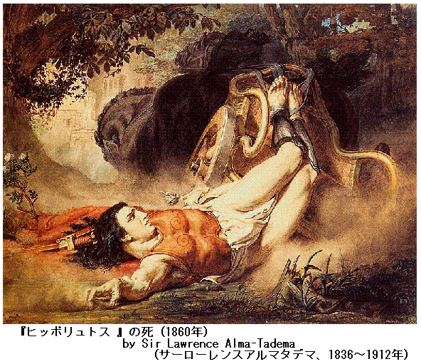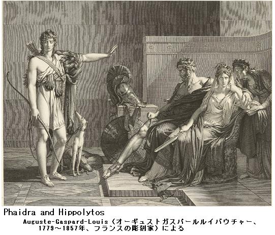 ギリシア神話:青年ヒッポリュトスはアテーナイの王Theseus(テーセウス)の庶子で亡くなったアマゾーンの女王ヒッポリューテの腹であった。常にアルテミス女神を崇めて童貞に身を持し常に女神に従っての山の狩倉に日を過し、また騎馬を好んで恋愛等には一向に耳を仮さなかった。戯曲ではそれが愛の女神Aphrodītē(アプロディーテ)の怒りに触れ、女神はおのが神威を侮り尊厳を並するものとして報復を図ろうとする。そしてテーセウスの妃で彼には継母に当たるPhaidra(パイドラー)に、義子である彼に対して絶望的な愛着の念を抱かすのである。/エウリーピーデースはパイドラーを邪恋に走る女としてではなく、むしろアプロディーテの犠牲となっても貞潔を守ろうと努め、そのためには死を択ぼうとしながら、自己の心情の優しさからこれを打ち明けさせる。テーセウスが海の彼方のトロイゼーンに旅行中の出来事であった。しかし事が漏れてヒッポリュトスに激しく罵り辱められ、おのが名を守るためにまた恐らくは報いられない恋を怨んで縊死を遂げる。傷ましくしかもある程度健気にまた常に優雅さを女性として描くことによって舞唱団の美しい抒情味豊かな詠唱と相俟って、詩人はこの悲劇をギリシア演劇の中でも屈指の優作としている。/死に際してパイドラーは、夫のテーセウス王に遺言を記し、義子ヒッポリュトスから邪な思いをかけられ辱めにあったため、死を決した旨をしたためる。旅から戻ったテーセウスは遺書を披いて予想のごとくに激怒し、父なる神ポセイドーンの呪いを彼の上に呼び下す。こうしてヒッポリュトスはその馬が突然に狂って車を海辺の巨巌に撃ちつけた結果、瀕死の状態で父テーセウスの許に運び込まれるのである。このとき、アルテミス女神が来降してヒッポリュトスのために弁護し彼の冤(むじつ)を雪(そそ)いでやる。一同の悔恨と悲愁のうちに、ヒッポリュトスの霊は天の昇って神と化するところで終る。