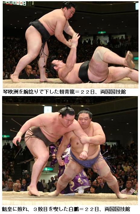 白鵬3敗に後退、朝青龍はV王手/初場所 ―― 大相撲初場所13日目(22日、両国国技館)横綱朝青龍は、大関琴欧洲を腕捻り(かいなひねり)で下し1敗で単独トップを堅持。横綱白鵬は大関魁皇に押し出しで敗れて3敗に後退した。/朝青龍は長身の琴欧洲の前まわしを取ると、身体を起こそうとする琴欧洲の手首を捻って投げ、琴欧洲は土俵に背中をついて敗れた。白鵬は魁皇に押し出しで敗れて2連敗、朝青龍と2差となった。14日目に朝青龍が日馬富士に勝てば2場所ぶり25度目の優勝が決まる。/優勝の可能性が残る把瑠都と安美錦の3敗対決は、一気に攻め込んだ安美錦と土俵際で投げを打った把瑠都が同時に倒れ込み、一度は把瑠都に軍配が上がったが物言いが付き取り直しとなった。取り直しの一番は把瑠都が安美錦を一気に押し出して10勝目。安美錦は4敗に後退した。日馬富士は垣添に押し出しで圧勝し3敗をキープ。豊響も猛虎浪を押し出しで下して3敗を守った。/若手の稀勢の里は鶴竜を下して8勝5敗、3場所ぶりの勝ち越しを決めた。6勝6敗同士の豊ノ島と豪栄道の対決は、土俵際まで寄られた豊ノ島が上手投げで逆転し、豪栄道を下した。白馬と若の里の4敗対決は、投げを打つ白馬に対し若の里が踏ん張り、最後は上手投げで若の里に軍配が上がった。/青森出身の高見盛と岩木山の“みちのく対決”は、岩木山が一気の攻めで寄り切って自己新の8連勝。高見盛は6勝7敗で負け越しのピンチとなった。/13日目を終えて1敗が朝青龍、3敗で白鵬、日馬富士、把瑠都、豊響の4人が追う形となった。(SANSPO.COM、2010.1.22 18:04)
