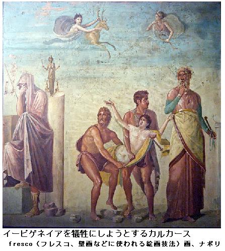 ギリシア神話:伝説ではIphigeneia(イーピゲネイア)はトロイア役のアカイア(ギリシア)方の総帥であるミュケーナイ王Agamemnon(アガメムノーン)の長女であった。出征に際しアルテミス女神の祟りによって《アガメムノーンが女神の聖鹿を射て取り神威を蔑(なみ)するような言動を用いたというと廉(かど)でという》逆風のために船隊が出航できなかった。その時預言者Kalchas(カルカース)の卜占によるとアガメムノーンの長女イーピゲネイアを女神の人身御供(ひとみごくう)に捧げたならば神怒を和らげ祀ることが出来ようという話であった。直ちに人を遣わし、ミュケーナイからイーピゲネイア姫が呼び寄せられた。母の王妃Klytaimnestra(クリュタイメースト)も同行した。表面ではギリシア方随一の勇士Achilleus(アキレウス)の花嫁にということであった。しかし大急ぎで婚礼の支度もそこそこに到着した一行が見出したものは、恐ろしい生贄の祭壇ばかりであった。歓喜から言いようもない悲嘆と怨みとに、姫も王妃も付き随う者共まで一息に突き落とされた。しかし激情の嵐が鎮まるにつれ、イーピゲネイアは自分の置かれた境遇に雄々しく対処していく道を撰んだ。彼女には夫に擬せられたアキレウスにも劣らない激しい気性と強靭な意志と自分の立場を誤りなく見取り計量する知性とが与えられていた。そして今度はみずから国のために人々のために、命を損(す)てようと言うのであった。