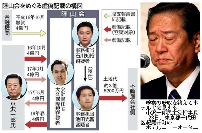 ■偽装:昨年3月4日午前。小沢氏は全身にカメラのフラッシュを浴びていた。前日に、小沢氏の公設第1秘書、大久保隆規容疑者(48)が西松建設の違法献金事件で逮捕されていた。「政治資金についてはすべてオープンにしている。収支を全部公開しているのは私だけではないか」民主党本部で開かれた記者会見で、小沢氏は国民に向かってこう強調した。この言葉が「ウソ」だったことが後に判明する。陸山会の土地購入をめぐる事件の捜査をきっかけに、政治資金収支報告書に記載していない収支がいくつも出てきたのだ。/同事件の逮捕容疑だけを見ても、平成16年分は土地代金の原資4億円の収入と土地代金約3億5千万円の支出、19年分は小沢氏への返済金名目の4億円の支出…。/「ウソ」は土地代金の原資についてもあった。この土地購入が問題となった後の19年2月、小沢氏は会見で「土地購入の原資は銀行からの融資だった」と述べた。/しかし実態は、融資は土地代金の原資4億円を隠すための偽装工作だったとされる。融資を受ける直前に土地代金を支払っていたからだ。小沢氏は偽装工作が発覚すると、今月16日の党大会で「私どもが積み立ててきた個人の資金」と「ウソ」を修正した。/さらに、同じ19年の会見で、小沢氏は「確認書」なるものを報道陣に提示している。登記上の所有権は小沢氏個人の名義だが、事実上の所有者は陸山会-というものだった。/確認書の作成日付は陸山会が収支報告書に土地購入を記載した17年1月7日。ところが、実際に作成した日付は会見の直前だった。土地購入が問題となり、慌てて帳尻あわせをしたとみられる。これも偽装工作といえるものだ。/「収支報告書に記載していない収支」「土地代金を装った融資」「陸山会の所有権を主張した『確認書』」…。小沢氏が偽装と気付いていたかは不明だが、自らの言葉で事実上、3つの「ウソ」を付いていたといえる。