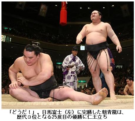 朝青、北の湖超え25度目の優勝!/初場所 ―― 大相撲初場所14日目(23日、両国国技館、観衆=11000)横綱朝青龍(29)が大関日馬富士(25)を下手投げで破り、13勝1敗として2場所ぶり25度目の優勝を決めた。優勝25回は北の湖を抜き、32回の大鵬、31回の千代の富士に次いで単独史上3位。13日目を終えて、横綱白鵬(24)らの後続に2差をつけており、14日目の白星で千秋楽を待たずに優勝となった。昨年は、年間86勝の史上最多記録を樹立したモンゴルの後輩、白鵬に主役の座を奪われたが、1年最初の場所を昨年に続いて制し、存在感を示した。/千秋楽を待つつもりは、毛頭ない。ここで決める。朝青龍が渾身(こんしん)の投げを打つ。右下手から引きずるような下手投げ。1分を超す相撲で、モンゴルの後輩日馬富士を土俵にたたきつけた。/2場所ぶり、歴代3位となる25度目の賜杯。こみ上げる興奮のなか、批判の対象とされるガッツポーズは封印したが、花道では手を振り、ファンの手にタッチした。「歴代3位? ブロンズメダルだね。20回目までは早かったけど、その後の5回はどうですかね。疲れもあった。最高の喜びにつながったのはすごくうれしいよ」。/昨年は進退のかかった初場所で復活優勝を果たし、秋場所でも優勝。それでも、年間86勝の史上最多記録をマークした白鵬との世代交代が、確実に進んだ。「昨年は7月、8月は体が痛くて、集中力がなくなった」。だが、年が変わり得意とする年頭場所で、史上最多タイの6度目の賜杯を手にして存在感を示した。/言動に問題の多い横綱は、今場所中も「品格」を落とした。前日発売された写真誌「FRIDAY」で初場所中に泥酔して知人に暴行したと報じられ、師匠の高砂親方(元大関朝潮)は日本相撲協会・武蔵川理事長(元横綱三重ノ海)に謝罪した。初場所後の25日以降には、同理事長が師弟を呼び出して注意することを明らかにしている。横綱も反省したようで、7日目以降は禁酒を始め、歓楽街への外出も控えた。/かねてから朝青龍の言動を厳しく批判する横綱審議委員会(横審)の内館牧子委員(脚本家)が今場所後の会合を最後に横審から勇退する。朝青龍は「内館さんの最後に花を持たせたかった」と気遣う余裕も。千秋楽では6連敗中の白鵬を倒して、土俵の覇権を奪回する。(SANSPO.COM、2010.1.24 05:04)