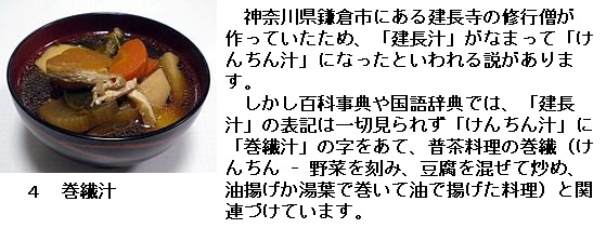 3 御御御付 →おみおつけ 4 巻繊汁 →けんちんじる